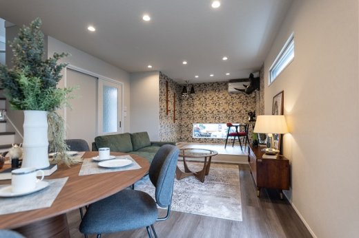 洗練された雰囲気の中に暖色を採り入れた、どこか懐かしい落ち着いたアンティーク風モダンな内外装の2階建て4LDKのモデルハウスです。